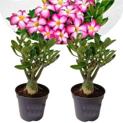 De Adenium, beter bekend als de woestijnroos, is een bijzonder mooie plant. Zoals de naam al zegt, is hij afkomstig uit de droge delen van de woestijn in Oost- en Noordoost-Afrika. Daar kan de Adenium wel 5 meter hoog worden met een prachtige kale stam. Gelukkig wordt de plant thuis niet zo hoog. Opvallend aan de Adenium zijn de prachtige roze bloemen, frisse groene bladeren en de grillige vorm van de stam.