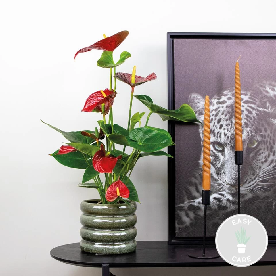 De Anthurium andreanum ‘Aristo’ heeft haar roots liggen in het verre Zuid-Amerika. Deze flamingoplant is zo’n succes door haar sterke karakter en bloei. Niet alleen is zij onderhoudsvriendelijk, ook laat zij haar altijd van haar beste kant zien. De anthurium is namelijk een van de langste non-stop bloeiende potplanten ter wereld. Het hele jaar door kan je genieten van haar dieprode hartvormige bloemen. Kortom, de flamingoplant heeft onze harten wel veroverd! Is rood niet jouw kleur? Geen probleem, de anthurium is ook gewoon verkrijgbaar in het roze, wit of zelfs oranje.