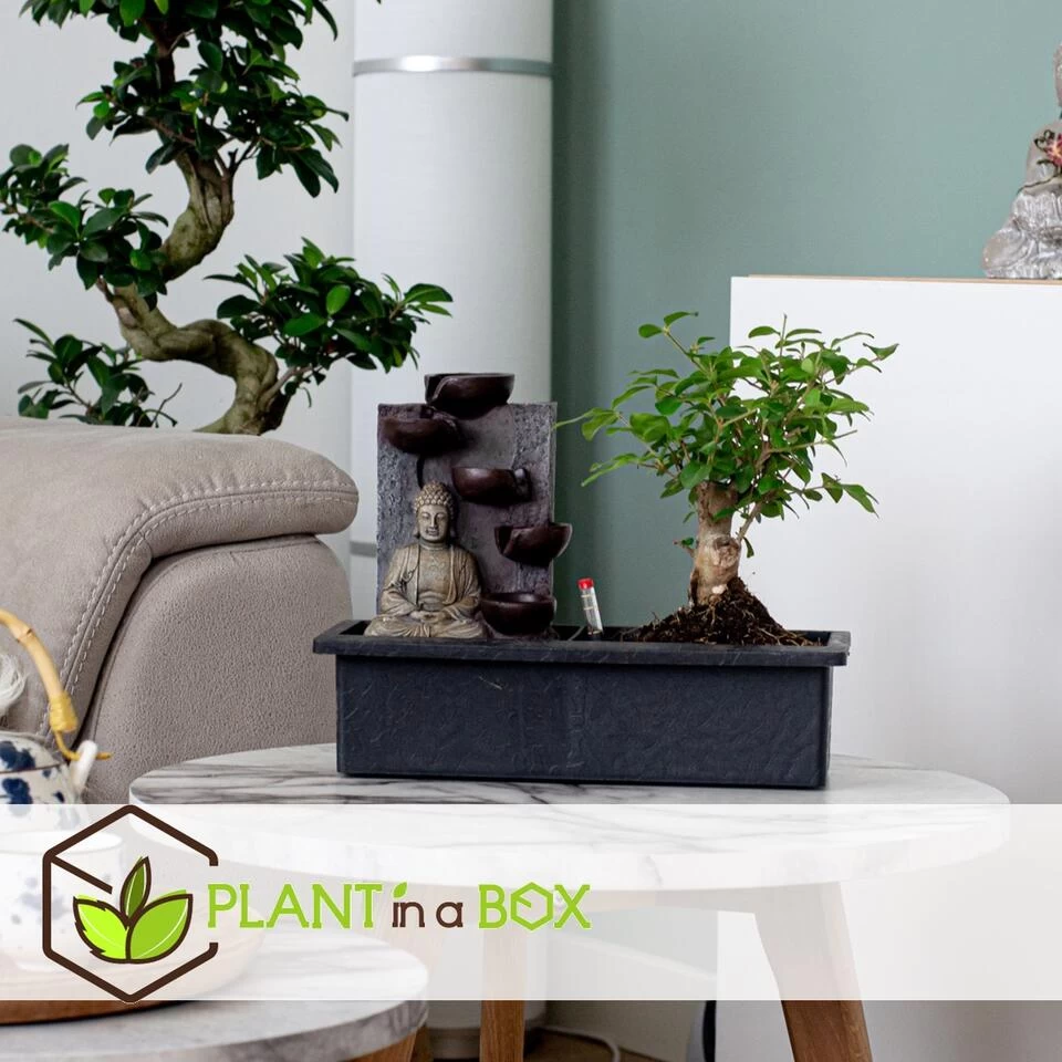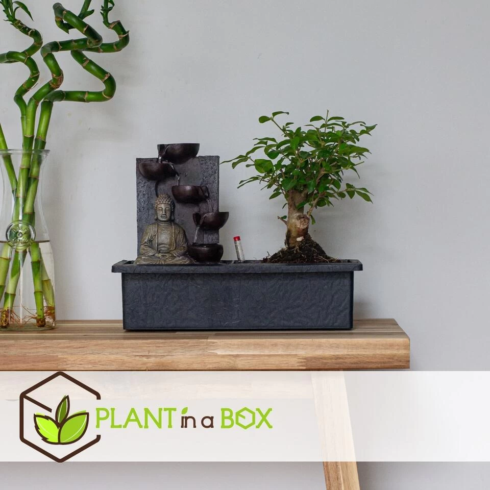 Het bonsai arrangement wordt geleverd inclusief een echt stromende waterval. Het geluid van het zachtjes stromende water zorgt voor nog meer ontspanning. De waterval werkt simpel: vul het bakje met water, stop de stekker in het stopcontact en het water begint te stromen. Ook erg leuk voor op je bureau, zo blijft je de hele dag โzenโ.