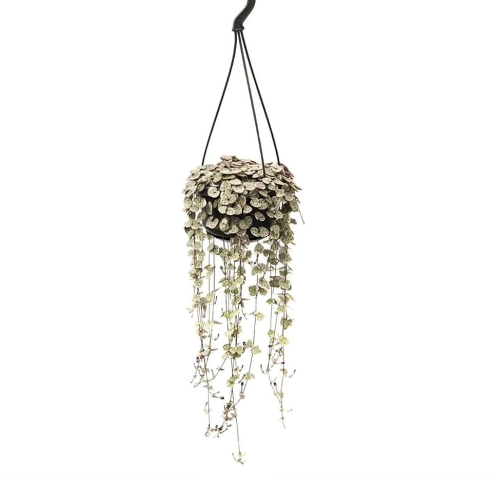De Latijnse naam van het Chinees lantaarnplantje is Ceropegia Woodii. Zijn bijnaam is echter “String of Hearts”, wat je snapt zodra je de plant ziet. De blaadjes lijken net allemaal kleine hartjes aan de strengen van de plant. Maar waar komt de naam Chinees lantaarnplantje dan vandaan? Deze bijzondere hangplant kan bloeien, en zodra hij dat doet verschijnen er bloemetjes die lijken op Chinese lantaarntjes. Een bijzondere, maar vooral ontzettend mooie plant om op te hangen.