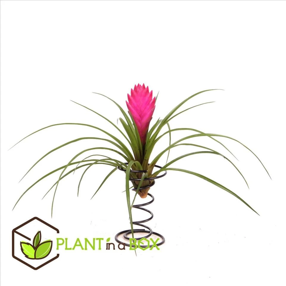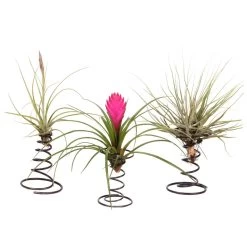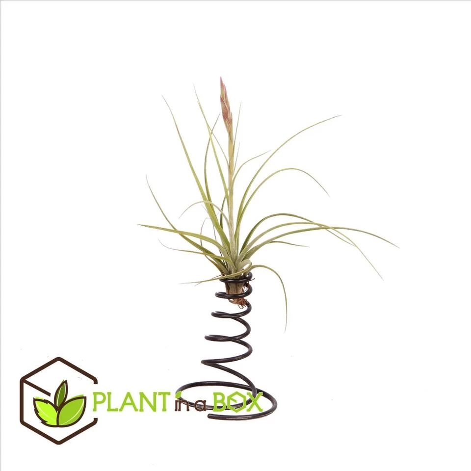 Drie verschillende Tillandsia luchtplantjes op een decoratieve spiraal. De Tillandsia is een familie van de Bromelia’s en telt meer dan 400 soorten. Het is een van de meest geïnstagramde planten van dit moment! De naam komt van de Zweedse botanicus Elia Tillands, die net als de Tillandsia een hekel had aan water. De planten komen oorspronkelijk uit de bossen, woestijnen en bergen van Zuid- en Midden-Amerika. Bijna alle Tillandsia zijn epifyten, dat wil zeggen dat ze geen of nauwelijks wortels hebben maar op bomen of rotsen groeien. Water en voedingsstoffen worden uit de lucht opgenomen door de schubben op de bladeren, daarom worden de Tillandsia’s ook vaak luchtplanten genoemd.